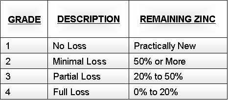 Grade #1 indicates a new conductor. Grade #2 shows that more than 50% of the zinc still remains on the core wire. A physical examination the core would show little or no rusting of the steel strands. A grade #3 would indicate that more than 50% of the zinc has been corroded causing a reduction in the ductility of the core wire. A Grade #4 signifies the steel core bundle has less than 20% of the original zinc coating. Dramatic loss in ductility and tensile strength will have occurred.